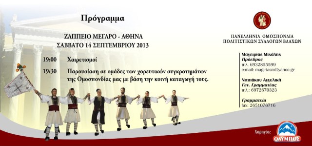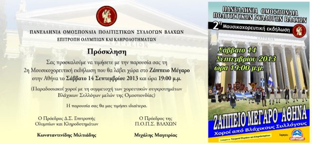 Η Πανελλήνια Ομοσπονδία Πολιτιστικών Συλλόγων Βλάχων και η Επιτροπή Ολυμπίων και Κληροδοτημάτων σας προσκαλεί να τιμήσετε με την παρουσία σας τη 2η Μουσικοχορευτική εκδήλωση που θα λάβει χώρα στο Ζάππειο Μέγαρο στην Αθήνα το Σάββατο 14 Σεπτεμβρίου 2013 και ώρα 19:00 μ.μ. Στην εκδήλωση θα παρουσιαστούν παραδοσιακόί χοροί απο τα χορευτικά συγκροτήματα των Βλάχικων Συλλόγων-μελών της Ομοσπονδίας.