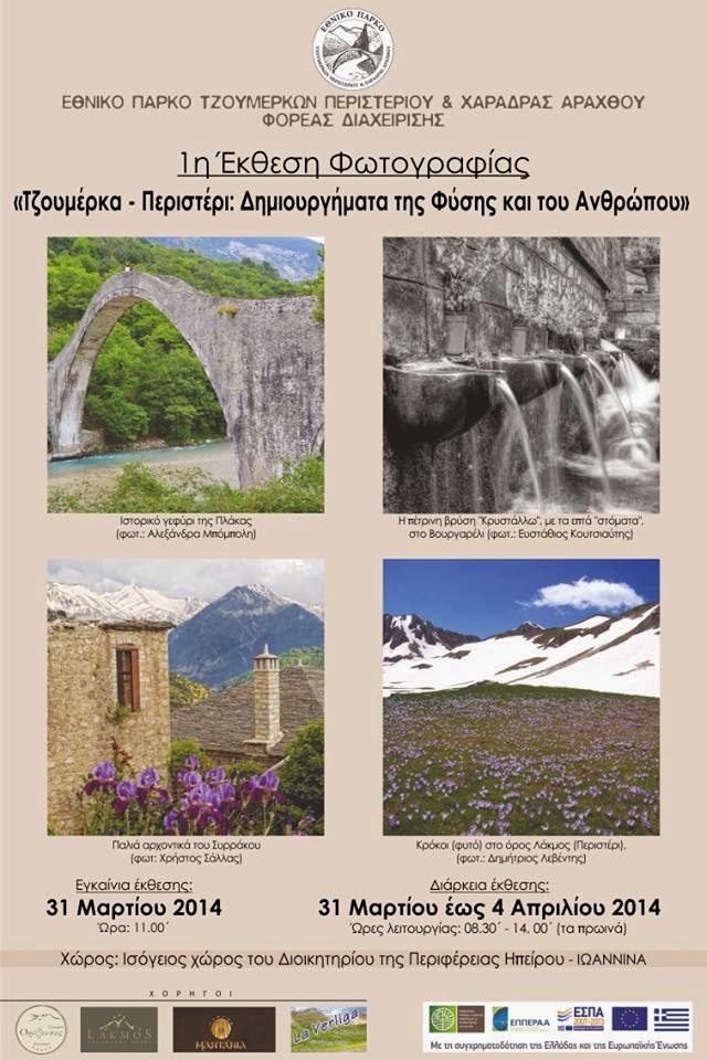Διοργάνωση έκθεση φωτογραφίας με θέμα: « Τζουμέρκα – Περιστέρι: Δημιουργήματα της Φύσης και του Ανθρώπου» ¨. Ο Φορέας Διαχείρισης του Εθνικού Πάρκου Τζουμέρκων, Περιστερίου και Χαράδρας Αράχθου ανακοινώνει τη λειτουργία έκθεσης φωτογραφίας, όπου θα παρουσιαστεί στο κοινό της πόλης των Ιωαννίνων τα θαυμάσια και μεγαλοπρεπή δημιουργήματα της φύσης και του ανθρώπου με τα οποία είναι σπαρμένη η προστατευόμενη περιοχή του Εθνικού Πάρκου. Η έκθεση θα φιλοξενηθεί, από 31 Μαρτίου έως 4 Απριλίου 2014, στο ισόγειο χώρο του Διοικητηρίου της Περιφέρειας Ηπείρου και θα είναι ανοιχτή για όλους, 08.30 -14.00 (τα πρωινά). Παράλληλα, τα δε εγκαίνια αυτής θα πραγματοποιηθούν την πρώτη μέρα (31/3/2014) στον ίδιο χώρο και ώρα 11.00πμ.