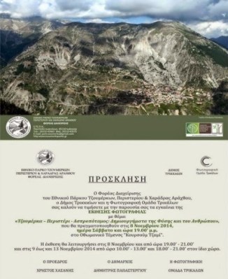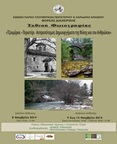 Ο Φορέας Διαχείρισης του Εθνικού Πάρκου Τζουμέρκων, Περιστερίου και Χαράδρας Αράχθου σε συνεργασία με το Δήμο Τρικκαίων και τη Φωτογραφική Ομάδα Τρικάλων ανακοινώνει τη λειτουργία έκθεσης φωτογραφίας, όπου θα παρουσιαστεί στο κοινό της πόλης των Τρικάλων τα θαυμάσια και μεγαλοπρεπή δημιουργήματα της φύσης και του ανθρώπου με τα οποία είναι σπαρμένη η προστατευόμενη περιοχή του Εθνικού Πάρκου.