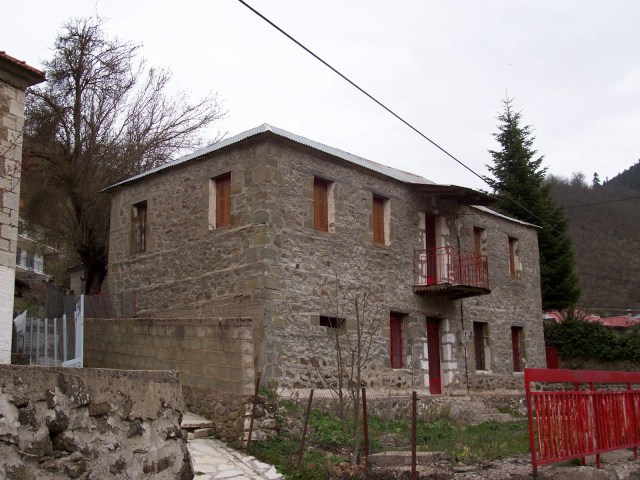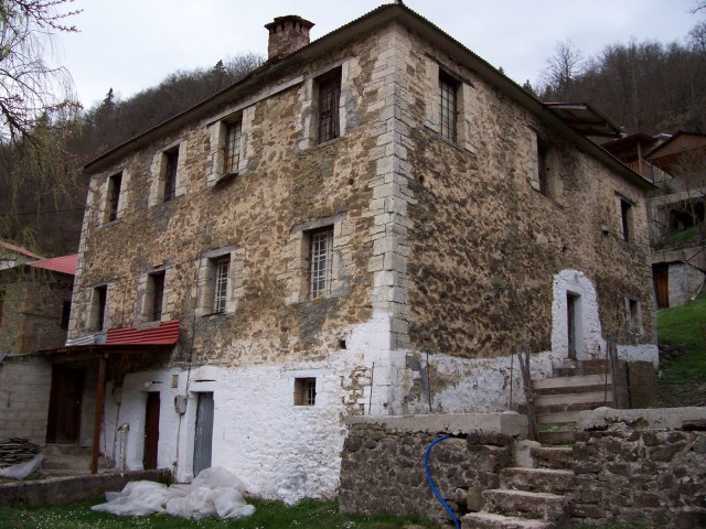 Οι πέτρες είναι κάτι παραπάνω από άφθονες στην περιοχή του Ασπροποτάμου. Δεν είναι λοιπόν περίεργο που το κύριο υλικό κατασκευής οικιών υπήρξε η πέτρα. Η συγκόλληση της πραγματοποιούνταν με ασβέστη και άμμο. Ο ασβέστης έβγαινε από το κάψιμο λίθων στις διάφορες ασβεσταρίες των χωριών. Οι χτίστες ήταν κυρίως Ηπειρώτες από χωριά όπως το Μιχαλίτσι και τα Πράμαντα. Στα συνάζια πάνω από τα κουφώματα χρησιμοποιούνταν κεδρόξυλα λόγω της αντοχής τους. Στη μεριά της κύριας εισόδου υπήρχαν κενά στις δυο πλευρές όπου έμπαινε το ξύλο που ασφάλιζε την πόρτα. Tο πάχος των τοίχων άγγιζε τα 60 εκατοστά. Οι λόγοι που επέβαλαν τους παχύς τοίχους ήταν πρώτον η ανάγκη προστασίας από το κρύο και τη ζέστη και δεύτερον η ανάγκη αντοχής του βάρους της σκεπής των σχιστολιθικών πλακών. Οι σκεπές αποτελούνταν από κορμούς ελάτου και από πλάκες. Σα υλικά μεταφέρονταν με άλογα ακολουθώντας τα μονοπάτια των χωριών. Η τοποθέτηση των πλακών απαιτούσε έμπειρους και περίτεχνους τεχνίτες οι οποίοι προέρχονταν