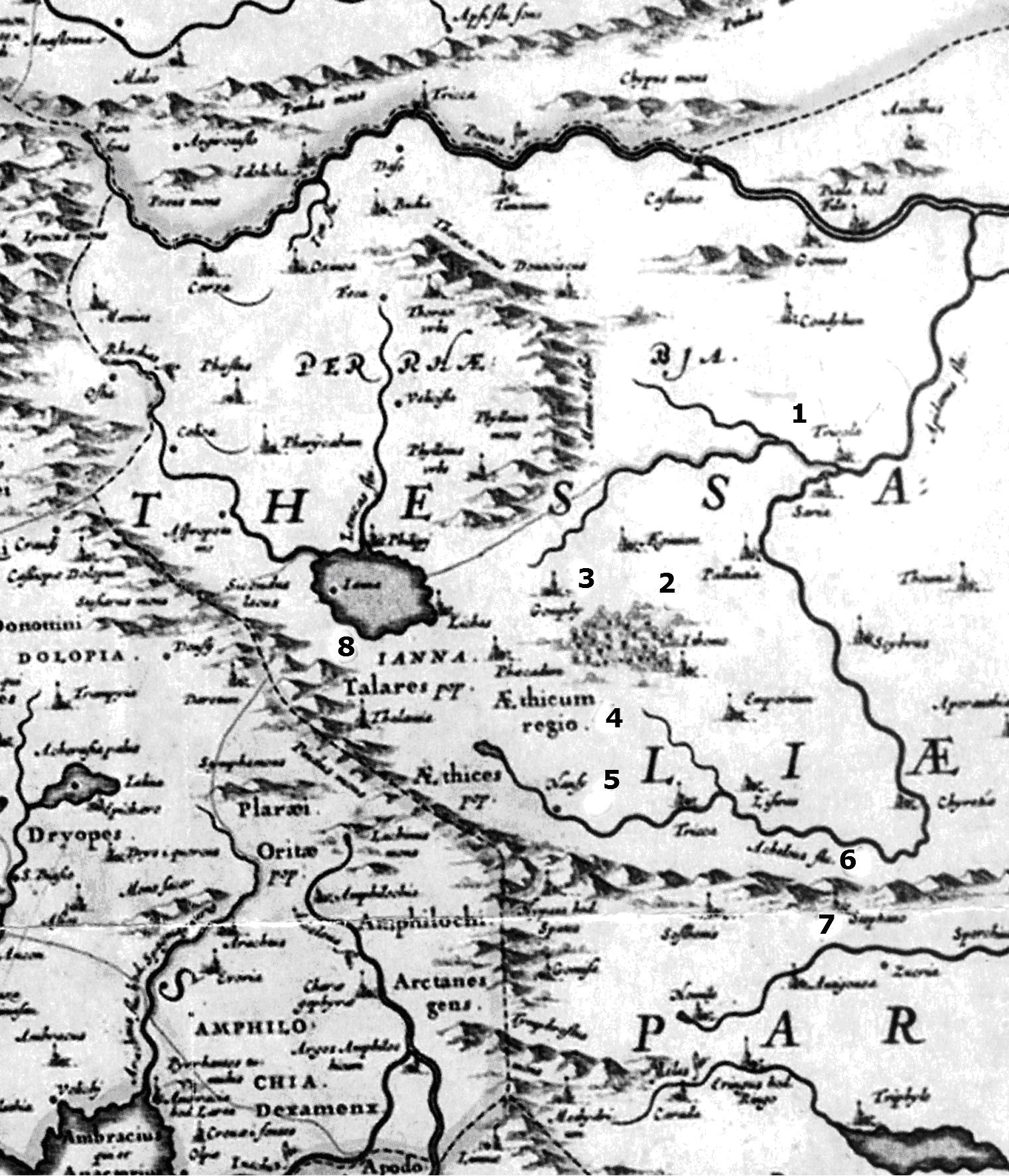 Ο χάρτης της Δυτικής Θεσσαλίας και της Ηπείρου που δημοσιεύω αποτελεί τμήμα του χάρτη που απεικονίζει τον ελλαδικό χώρο ανά γεωγραφική περιοχή (Αττική, Πελοπόννησος κ.λ.π). Έχει συνταχθεί από τον Δανό ιστορικό και γεωγράφο Γιόχαν Λαουρεμπέργκ το έτος 1638 και έχει εκδοθεί σε 500 μόνο αντίτυπα. Οι πληροφορίες που μας παρέχουν οι χάρτες του 16ου, 17ου και 18ου αιώνα προέρχονται από καταγραφές Ευρωπαίων γεωγράφων και περιηγητών που βρέθηκαν στην Ελλάδα εκείνη την περίοδο. Η πλειονότητά των περιηγητών ήταν Βρετανοί αξιωματικοί, οι οποίοι συνοδεύονταν σε πολλές περιπτώσεις από γεωγράφους επιφορτισμένους με τη χαρτογράφηση της άγνωστης μέχρι τότε ελληνικής ενδοχώρας. Εστιάζοντας στην περιοχή του Ασπροποτάμου θεωρώ ότι ο χάρτης αποτελεί ένα σημαντικό τεκμήριο ιστορίας για τα βλαχοχώρια της περιοχής. Αν και ορισμένα λάθη, κυρίως στην κλίμακα καταγραφής των γεωγραφικών στοιχείων, όπως και στη χωροθέτηση ορισμένων οικισμών είναι προφανή, η ιστορική αξία του χάρτη για την περιοχή του Ασπροποτάμου είναι σημαντική. Στον χάρτη παρατηρούμε ότι εκτός από τα βασικά γεωγραφικά στοιχεία (βουνά, ποταμοί, λίμνες) σημειώνονται οι περιοχές εγκατάστασης των πρώτων ελληνικών φύλων (Αίθηκες, Δόλοπες) όπως και οι κυριότεροι οικισμοί εκείνης της περιόδου. Οι οικισμοί που έχουν χαρτογραφηθεί στην περιοχή του Ασπροποτάμου είναι το Χαλίκι και το Συρράκο, απόδειξη ότι ήδη από τον 16ο αιώνα αυτά τα χωριά αποτελούσαν τις πιο οργανωμένες κοινότητες με πλούσια εμπορική δράση και αξιοσημείωτο πληθυσμό. Οι αριθμοί που σημειώνω στον χάρτη αντιστοιχούν στις παρακάτω ονομασίες: 1. Τρίκαλα 2. Οι Μονές των Μετεώρων 3. Γόμφοι 4. Η περιοχή των Αιθήκων 5. Χαλίκι 6. Αχελώος ποταμός 7. Συρράκο 8. Ιωάννινα και η λίμνη των Ιωαννίνων.